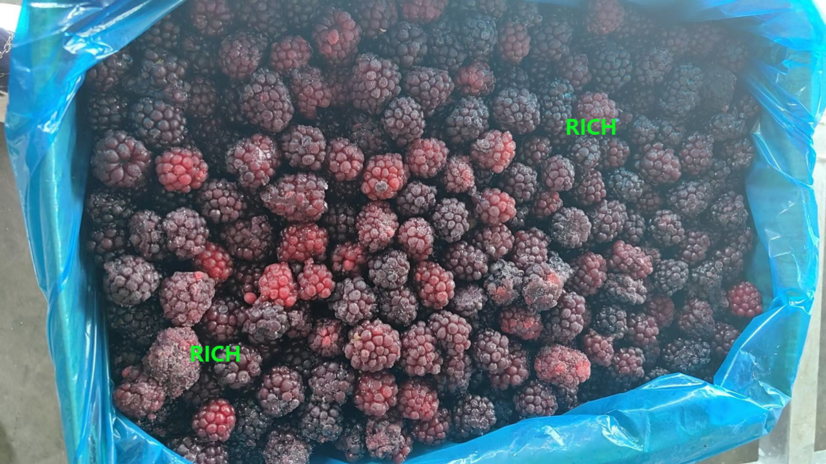 Only berries meeting freeze-grade standards are selected; substandard fruit is diverted to purée or juice lines.